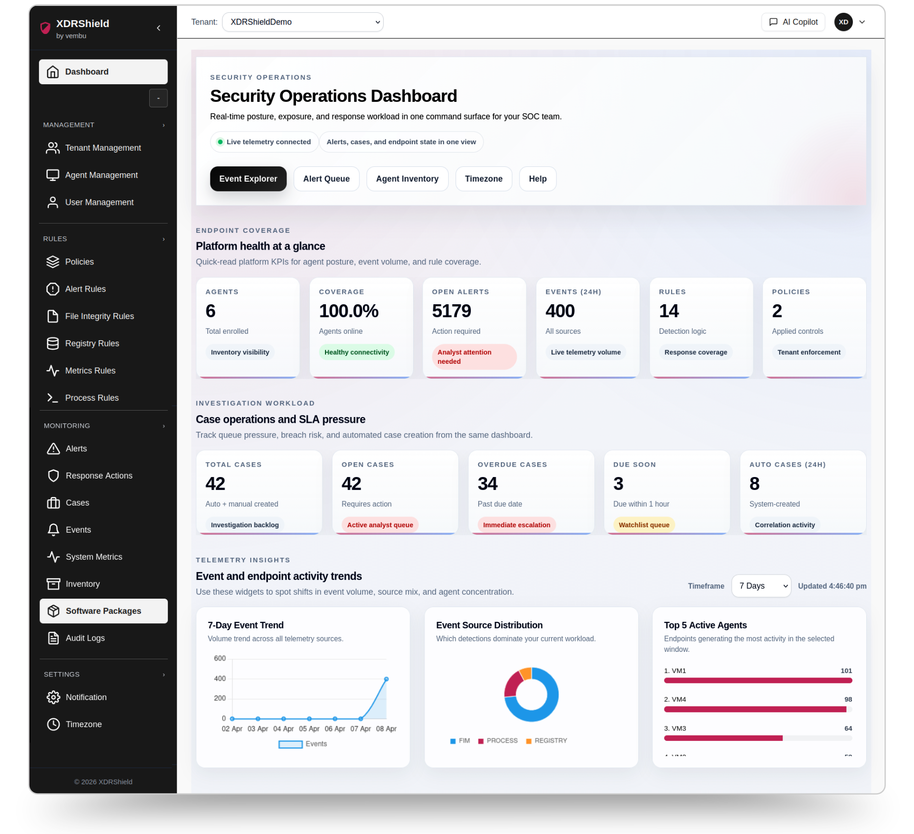 Experience real-time endpoint monitoring, structured investigation cases, automated playbooks, and multi-tenant SOC operations from a single platform built for modern security teams.